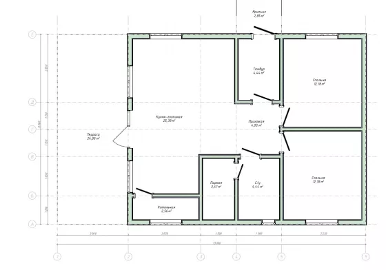 · Всё для ПМЖ: есть котельная (2.56 м²)с котлом, тамбур (4.44 м²) — защита от холода, санузел (4.44 м²).