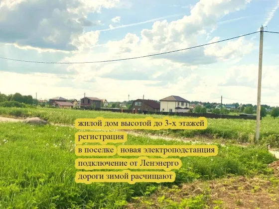 На таких участках разрешено строительство жилых домов высотой до 3х этажей, при постановке на учет жилого дома Вы получаете регистрацию по месту жительства. Участок ровный и сухой, правильной формы. Места хватит для строительства большого дома, а также есть место для гаража, бани, беседки и прочих строений. В поселке построена новая электроподстанция, надежно обеспечивающая энергопотребление до 15 кВт. Подключение по заявлению собственника участка в Ленэнерго. Водоснабжение делают из индивидуальных скважин глубиной до 27-28 метров. Круглогодичный подъезд к участку, дороги зимой расчищают.